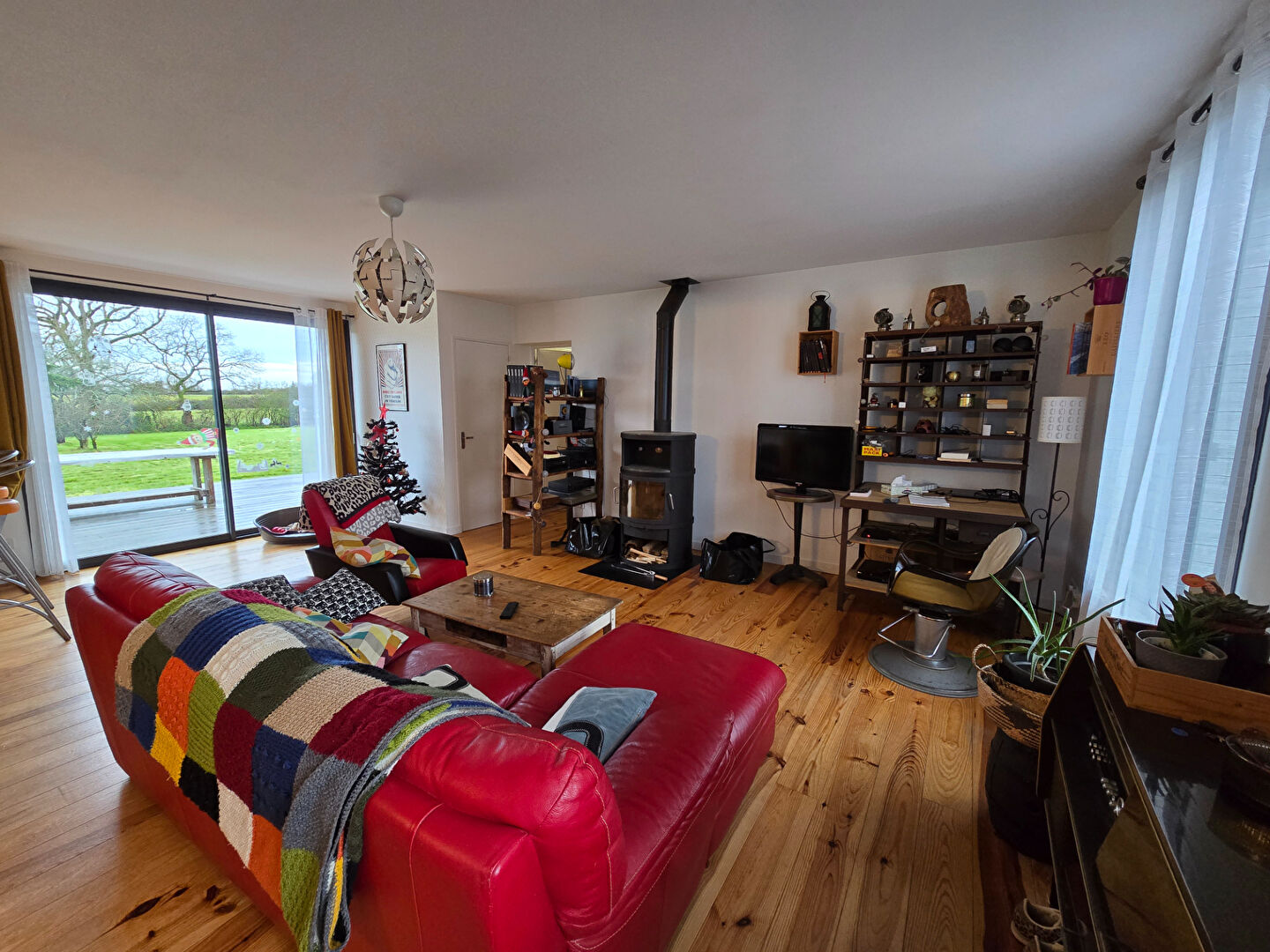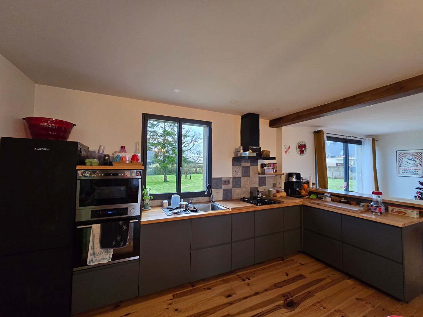 Dès l'entrée, vous découvrirez une belle pièce de vie lumineuse, conviviale et chaleureuse, agrémentée d'un poêle à bois, idéale pour les soirées d'hiver. La cuisine ouverte, entièrement aménagée et équipée, s'intègre parfaitement à l'espace et invite au partage.